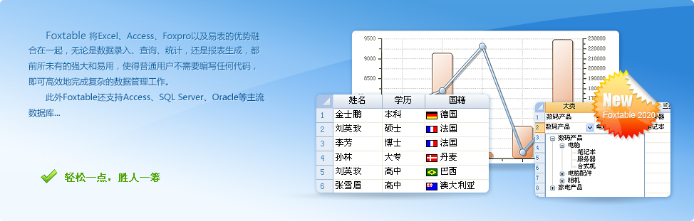 Foxtable將Excel、Access和Foxpro的優(yōu)勢(shì)融合在一起,并獨(dú)有層級(jí)數(shù)據(jù)管理功能,普通用戶(hù)不需要編寫(xiě)任何代碼,即可完成各種復(fù)雜的數(shù)據(jù)管理工作,真正做到拿來(lái)即用。